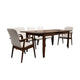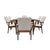 Incluye 6 sillas de madera sólida, tapizadas en tela gris, con capacidad de hasta 120 kg por asiento, ofreciendo comodidad y durabilidad con un diseño moderno.