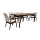 La mesa rectangular está fabricada con tablero de MDF recubierto con chapa natural de madera en acabado nogal, ofreciendo un diseño cálido, moderno y muy resistente, perfecto para 8 personas.
