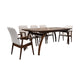 La mesa rectangular está fabricada con tablero de MDF recubierto con chapa natural de madera en acabado nogal, ofreciendo un diseño cálido, moderno y muy resistente, perfecto para 8 personas.