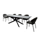 La mesa destaca por su superficie de Piedra Armani, un material de alta gama que emula la belleza del mármol, pero con una mayor resistencia y durabilidad. Su acabado pulido y brillante refleja la luz, aportando luminosidad y profundidad al espacio. La estructura metálica de la mesa, de diseño minimalista y robusto, complementa la elegancia de la piedra, garantizando estabilidad y un estilo moderno que resalta en cualquier comedor.